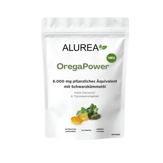 Mit der 2in1-Formel aus Oregano- und Schwarzkümmelöl versorgt dich Alurea OregaPower mit kraftvollen Pflanzenstoffen, die deine natürliche Abwehr fördern und zu deinem Wohlbefinden beitragen.