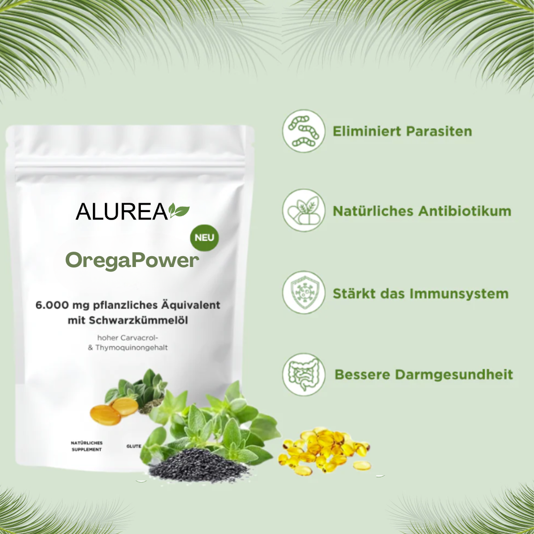 Mit der 2in1-Formel aus Oregano- und Schwarzkümmelöl versorgt dich Alurea OregaPower mit kraftvollen Pflanzenstoffen, die deine natürliche Abwehr fördern und zu deinem Wohlbefinden beitragen.