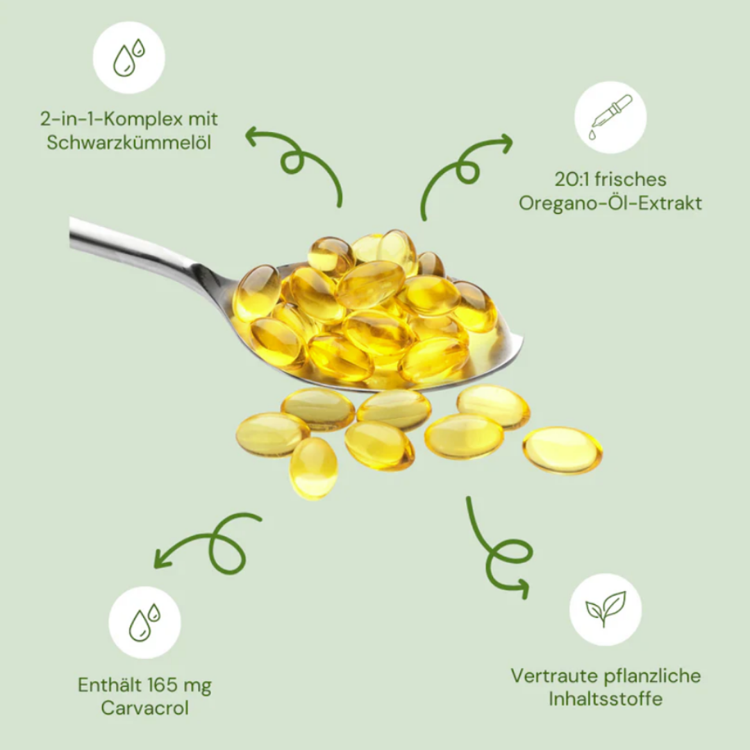 Alurea OregaPower ist eine natürliche Kombination aus Oregano- und Schwarzkümmelöl. Zwei traditionelle Pflanzenöle, die seit Jahrhunderten für ihre positiven Eigenschaften auf Verdauung, Abwehrkräfte und allgemeines Wohlbefinden geschätzt werden.